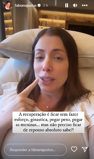 Já de volta ao aconchego do lar, ela fez outros posts para falar sobre a recuperação e o esforço que precisará fazer para não pegar as filhas gêmeas no colo. “A recuperação da cirurgia com bebê agitado lá dentro é um pouco mais complexa. A recuperação é ficar sem fazer esforços, ginástica, pegar peso, pegar as meninas, mas não preciso ficar de repouso absoluto, sabe?”, contou.