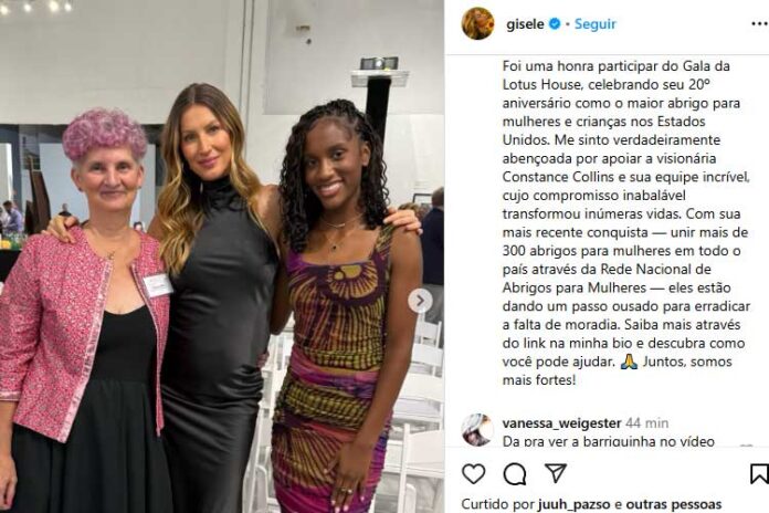 Gisele disse que se sente feliz em apoiar uma causa tão importante, responsável por transformar a vida de inúmeras pessoas. “Me sinto verdadeiramente abençoada por apoiar a visionária Constance Collins e sua equipe incrível, cujo compromisso inabalável transformou inúmeras vidas”, celebrou.