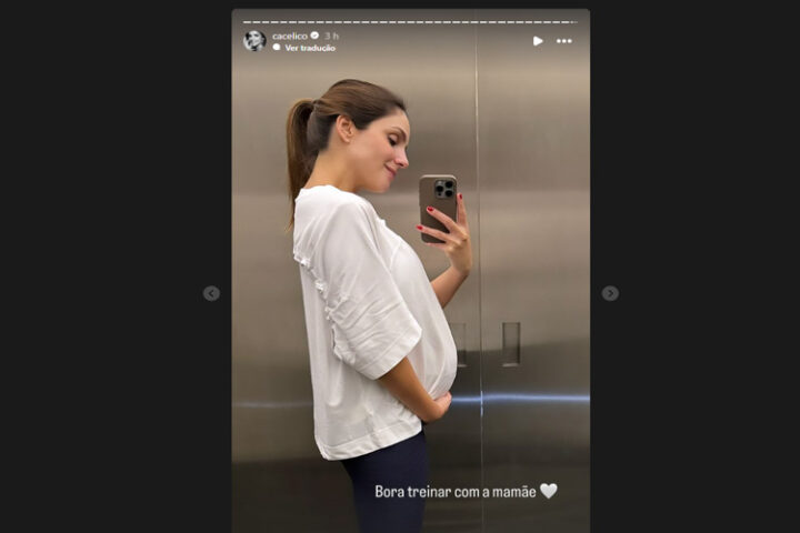 Carol Celico usou o seu Stories no Instagram para mostrar a evolução de sua barriga durante a sua terceira gravidez nesta segunda-feira (04). A empresária compartilhou uma foto em frente ao espelho segurando a barriga.
