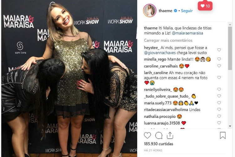Como era de se esperar, Thaeme foi, e muito, paparicada pelas gêmeas mais famosas do sertanejo no camarim. Em sua rede social, a loira compartilhou uma foto em que Maiara e Maraisa aparecem beijando a sua barriguinha de grávida. Na legenda, a grávidinha escreveu: “Iti Malia, que lindezas de titias mimando a Liz”.