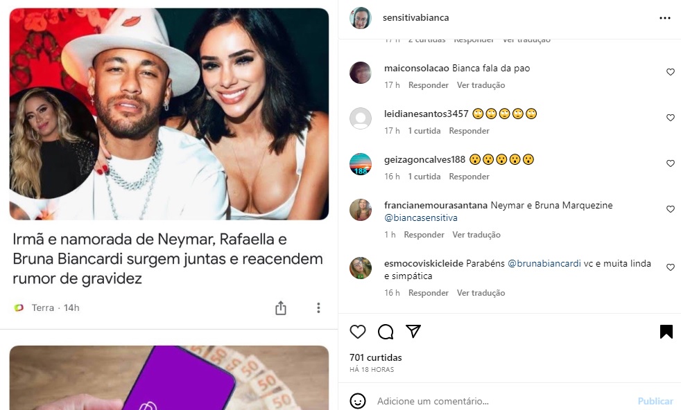 O burburinho começou após Bianca Sensitiva voltar a comentar sobre a previsão de gravidez entre Bruna Biancardi e Neymar. Na ocasião, ela compartilhou uma notícia sobre o casal e afirmou que a influenciadora logo ficará gravida.