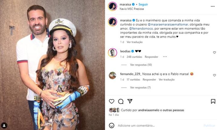 Por meio do feed no Instagram, Maraisa publicou uma foto suspeita do casal agarradinho e chamou a atenção dos fãs, principalmente pela posição das mãos do casal na região da barriga. Apaixonada pelo futuro marido, a cantora o exaltou: “Eu e o marinheiro que comanda a minha vida curtindo o cruzeiro @maiaraemaraisaemaltomar, obrigada meu amor, @fernandomoco, por sempre estar em momentos tão importantes da minha vida, obrigada por sua companhia e por ser meu parceiro de vida, te amo muito“, disse ela.