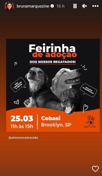 Diferentemente de comentar sobre a suposta gravidez, Marquezine utilizou as suas redes sociais para pedir ajuda dos fãs. Assim, compartilhou uma campanha de adoção de animais de estimação que acontecerá em São Paulo.