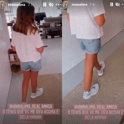 “Ela tem nove anos e está usando o meu tênis, meu Deus tá muito gigante”, disse em tom de surpresa. No destaque do stories, ela avisou: “Amiga o tênis que você me deu agora é dela kkkk”.