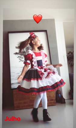 A atriz escreveu “Julho” e colocou um coração na publicação em que a pequena aparece com um lindo vestido vermelho, branco e preto, uma meia calça branca e uma botinha preta. No cabelo, a mamãe penteou Sofia com duas maria chiquinhas alta, além de enfeitar com uma tiara temática.