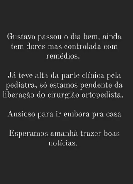 Dessa forma, segundo os familiares de Gustavo Corasini, ele está bem e feliz em poder voltar para casa à qualquer momento. “Gustavo passou o dia bem, ainda tem dores, mas controladas com remédios. Já teve alta da parte clínica pela pediatra, só estamos pendentes da liberação do cirurgião ortopedista. Ansioso para ir embora para casa. Esperamos trazer amanhã boas notícias”, destaca a nota divulgada nas redes sociais.