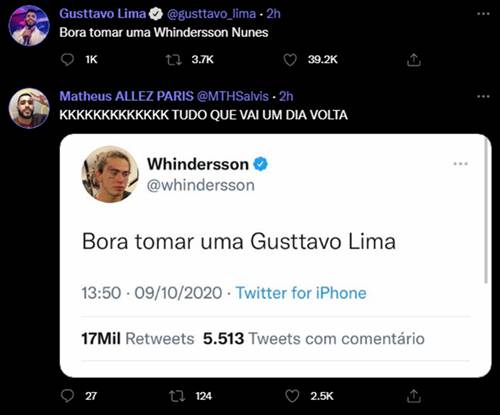 O cantor sertanejo usou as redes sociais para dar o troco em Whindersson, que fez uma brincadeira no momento errado, quando Gusttavo se separou de Andressa Suita. No Twitter, o sertanejo foi convidado pelo youtuber para sair para beber. Agora, ele retribuiu o convite: “Bora tomar uma Whindersson Nunes”, escreveu no microblog, relembrando o convite que recebeu no passado do humorista.