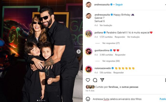 No feed do Instagram, Andressa Suita mostrou todos os detalhes da festança e escreveu na legenda: “Feliz aniversário. Gabriel, 7, e Samuel, 6“, dizia a postagem da celebração, que teve como tema videogame. O quarteto, inclusive, combinou os looks, com roupas pretas e o casal de óculos escuros.