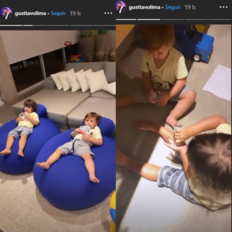 Em seus stories do Instagram, o cantor mostrou os herdeiros Gabriel e Samuel deitados, assistindo TV enquanto tomam mamadeira. Pouco tempo depois, ele se derreteu e se divertiu ao filmar os herdeiros se prevenindo passando álcool gel.