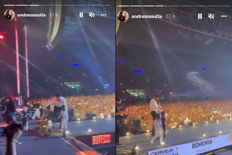 Com o estádio lotado de fãs, entre uma canção e outra, uma cena muito fofinha aconteceu. Os filhos do sertanejo, frutos do seu casamento com a modelo Andressa Suíta, os herdeiros, Gabriel e Samuel, acabaram encantando o público ao subirem no palco.