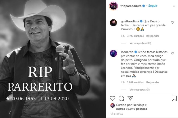 O cantor sertanejo Gusttavo Lima utilizou as suas redes sociais para prestar as devidas condolências para Parreirito, integrante do Trio Parada Dura, que faleceu neste último domingo (13), por complicações da Covid-19, doença causada pelo novo coronavírus.