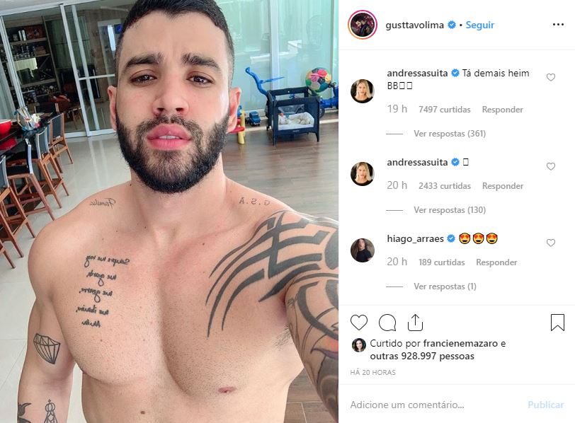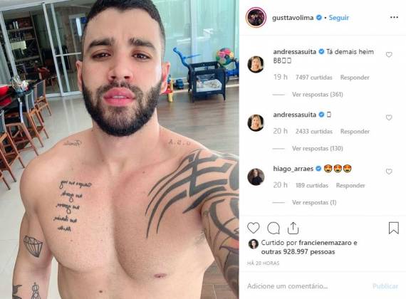 A foto ‘ousada’ de Gusttavo Lima acabou rendendo uma bela bronca da esposa, a modelo Andressa Suita. Nos comentários da publicação ela deu um puxão de orelha no marido, por ficar exibindo o corpão nas redes sociais.