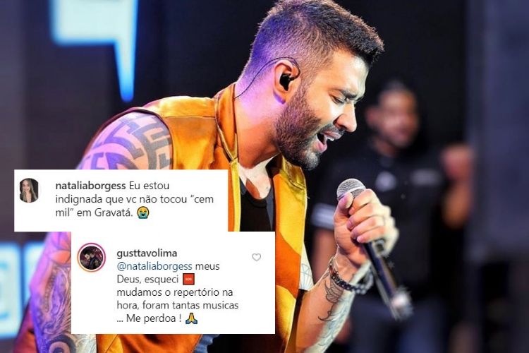 O motivo? Segundo a fã, o sertanejo não cantou uma de suas músicas preferidas no show: “Eu estou indignada que você não tocou “cem mil” em Gravatá”, disse ela. Após ver o comentário, Gusttavo Lima fez questão de responder e pedir desculpas para a admiradora.