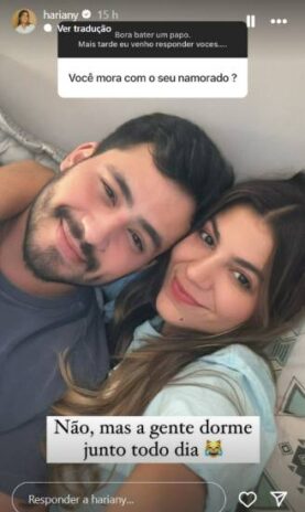 “Você mora com o seu namorado?”, questionou a pessoa, que não teve a identidade revelada por Hariany, através dos stories do Instagram. “Não (estamos morando juntos)”, ressaltou a influenciadora negando o questionamento. Porém, em seguida, ela fez uma afirmação sobre a relação deles: “Mas a gente dorme junto todo dia (risos)”, declarou a ex-sister da casa mais vigiada do Brasil.