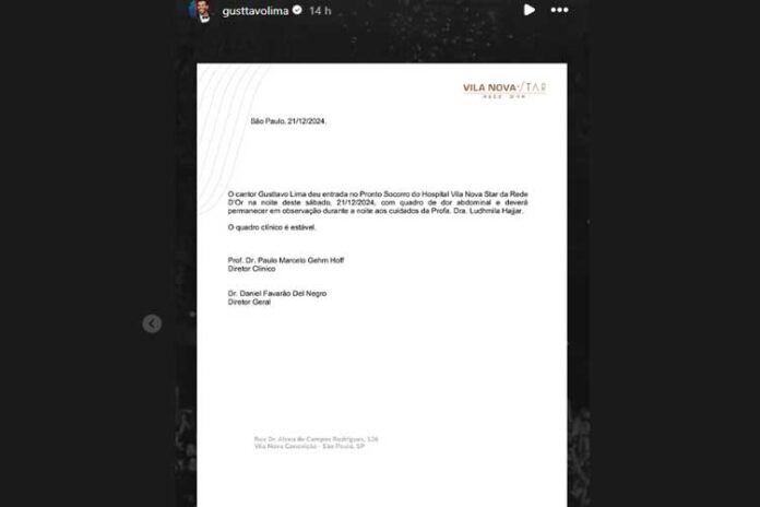 Através de um Stories compartilhado em seu perfil o Instagram, foi informado que o seu quadro clínico é estável. “O cantor Gusttavo Lima deu entrada no Pronto Socorro do Hospital Vila Nova Star da Rede D’Or na noite deste sábado, 21/12/2024, com quadro de dor abdominal e deverá permanecer em observação durante a noite aos cuidados da Profª Dra. Ludhmila Hajjar. O quadro clínico é estável”, informam.
