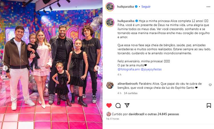 Os seguidores de Hulk logo reagiram nos comentários. “Parabéns pra essa princesa!!! Feliz novo ciclo Alice!!”, disse um. “Parabéns para a Alice, muita saúde, paz e conquistas. Forte abraço”, escreveu outro. “Linda demais!”, elogiou mais um.