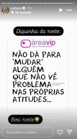 Através dos stories no Instagram, Poliana Rocha chamou atenção ao publicar uma indireta em sua ‘Diquinha da Noite’, levando alguns internautas a acreditarem que a postagem seria direcionada a atriz internacional. “Não dá para ‘mudar’ alguém que não vê problema nas próprias atitudes“, dizia a mensagem. Para completar a frase, a influenciadora ainda acrescentou um: “Boa noite“, com emoji de estrela.