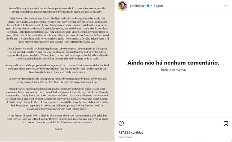 Sobre o luto, a criadora de conteúdo falou da angústia e assumiu a responsabilidade pela morte. “É uma dor, uma angústia e um vazio que nenhuma família deveria jamais ter que suportar… Assumo total responsabilidade como mãe do Trigg, e sei que deveria ter feito mais para protegê-lo. Uma das lições mais difíceis que carrego é que uma cerca permanente na piscina poderia ter salvado sua vida, e é algo que nunca mais vou negligenciar. Espero que, em meio a essa dor, a história do Trigg ajude a prevenir que outras crianças e famílias sofram a mesma perda”, escreveu em outro trecho da publicação.