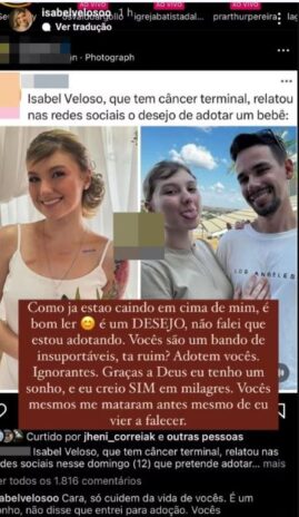 Horas depois, ele desabafou sobre os ataques de haters que o casal sofreu e fez vídeos lamentando. Já Isabel, que falou do desejo de adotar uma criança, também foi muito atacada, desabafando sobre o assunto nos stories: “Como já estão caindo em cima de mim, é bom ler. É um DESEJO. Não falei que estou adotando. Vocês são um bando de insuportáveis. Está ruim? Adotem vocês. Ignorantes. Graças a Deus, eu tenho um sonho, e eu creio, SIM, em milagres. Vocês mesmos me mataram antes mesmo de eu vir a falecer“, escreveu ela.