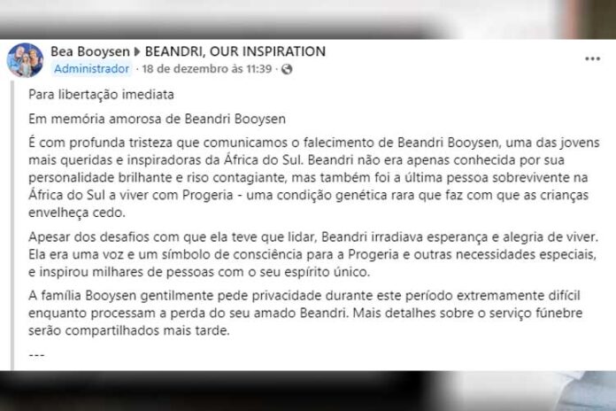 A influenciadora Beandri Booysen fazia muito sucesso no Tik Tok ao publicar vídeos motivacionais. Portadora de uma síndrome rara conhecida como Hutchinson-Gilford (Progéria), infelizmente a TikToker faleceu aos 19 anos.