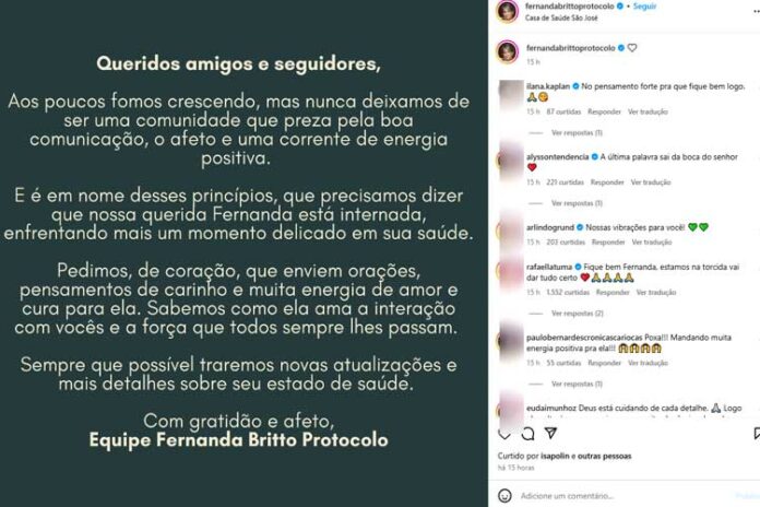 “Sempre que possível traremos novas atualizações e mais detalhes sobre seu estado de saúde. Com gratidão e afeto, equipe Fernanda Britto Protocolo”, completa o comunicado.