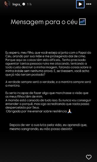 “Eu seria incapaz de fazer algo que manchasse a visão que os meus filhos têm de mim. A mamãe está cansada de tudo isso. Eu nunca vou conseguir entender o porquê, mas sigo acreditando que nada passa despercebido por Deus. Obrigada por me ensinar sobre resiliência. Depois de ver a sua luta pela vida, eu aprendi que, mesmo sangrando, eu não posso desistir“, completou Ingra Soares.
