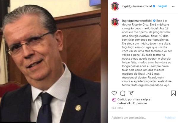 A atriz se emocionou ao fazer uma homenagem ao médico Ricardo Cruz, cirurgião que importante em sua vida. Ela publicou a foto do médico e fez um longo texto para homenageá-lo.