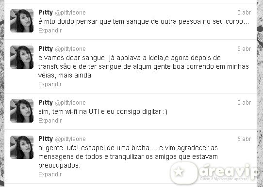 Após ser internada com fores dores no abdômen, a cantora Pitty escreveu em seu Twitter para agradecer os fãs. “Oi gente. Ufa, escapei de uma braba! Vim agradecer as mensagens de todos e tranquilizar os amigos que estavam preocupados”, escreveu a cantora.
