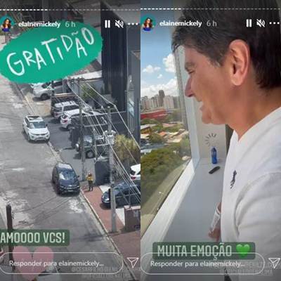 Nesta terça-feira, o apresentador do ‘Hoje em Dia’ recebeu uma grande surpresa e Elaine mostrou tudinho para os seguidores nas redes sociais. Como tem que permanecer em isolamento devido a doença, a família fez cartazes e ficou no carro, do lado de fora do hospital Vila Nova Star, saudando o apresentador.