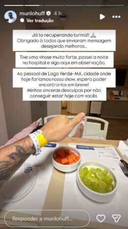 Agora, após o susto, Murilo Huff tranquilizou os milhares de seguidores e informou que já está melhor. Em suas redes sociais, o músico contou que segue em observação no hospital e, por recomendações médicas, não poderá se apresentar no evento Lava Pratos Gigante 2026, em Lago Verde, no Maranhão.