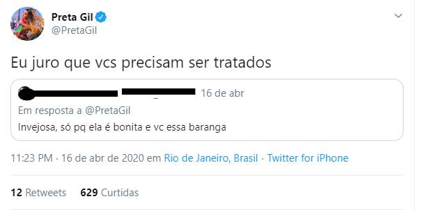 Uma internauta se mostrou irritada com o comentário feito por Preta e decidiu fazer uma declaração bem desagradável. “Invejosa. Só porque ela é bonita e você essa baranga”, escreveu. A cantora, no entanto, não deixou o comentário passar batido e respondeu: “Eu juro que vocês precisam ser tratados.”