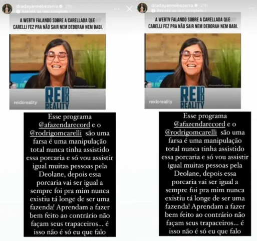 Ela ainda disse em sua rede social: “Gente essa ‘A Fazenda’ é muito suja! Até podcast de alguém falando da Deo, eles postam! Rodrigo Carelli você e seus programas são nojentos, sem credibilidade”, se manifestou Dayanne. Por fim, ela ofendeu Babi por ter se tornado a fazendeira da semana. “A prova foi feita para lixo ganhar né, ‘A Fazenda’?”, concluiu.