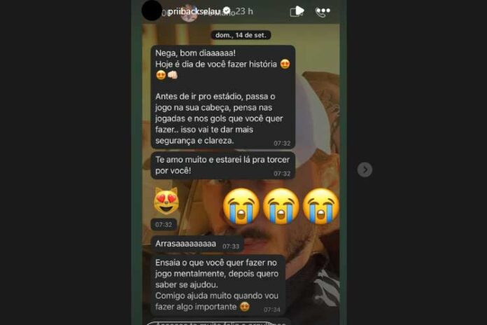 No Registro publicado em seu Stories, ela recebe um recado motivacional de Selau, que pede para que Priscila se concentre nas jogadas para dar o seu melhor em quadra. “Nega, bom dia! Hoje é dia de você fazer história! Antes de ir pro estádio, passa o jogo na sua cabeça, pensa nas jogadas e nos gols que você quer fazer…isso vai te dar mais segurança e clareza”, pede o ator.