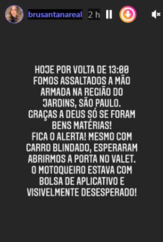 Ela deu detalhes nos stories de seu perfil oficial no Instagram. “Hoje, por volta de 13h, fomos assaltados à mão armada na região do Jardins, São Paulo. Graças a Deus só se foram bens matérias! Fica o alerta! “, desabafou Bruna.