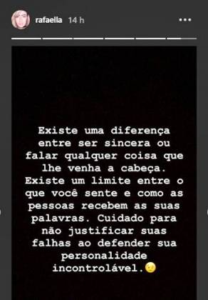Na madrugada desta terça-feira (11), a gata usou o Stories do Instagram para desabafar e postou uma mensagem enigmática sobre pessoas que falam o que pensam: “Existe uma diferença entre ser sincera ou falar qualquer coisa que lhe venha à cabeça. Existe um limite entre o que você sente e como as pessoas recebem as suas palavras. Cuidado para não justificar suas falhas ao defender sua personalidade incontrolável”.
