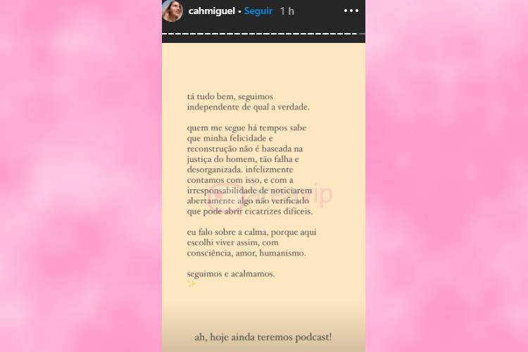 Em sua conta oficial do Instagram, ela desabafou e lamentou a desorganização dos policiais e da Justiça em torno de uma solução sobre o caso: “Está tudo bem. Seguimos, independente de qual a verdade. Quem me segue há tempos sabe que minha felicidade e reconstrução não é baseada na justiça do homem, tão falha e desorganizada”, disse.