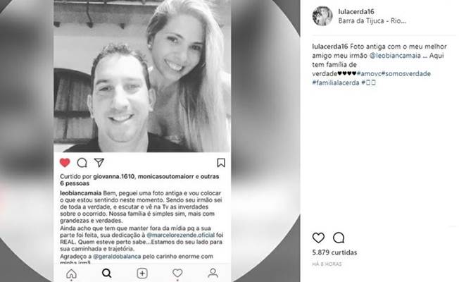 Luciana compartilhou o post do irmão e ainda alfinetou a família de Rezende:”Foto antiga com o meu melhor amigo, meu irmão Leo. Aqui tem família de verdade. Amo você. Somos verdade. Família Lacerda“.