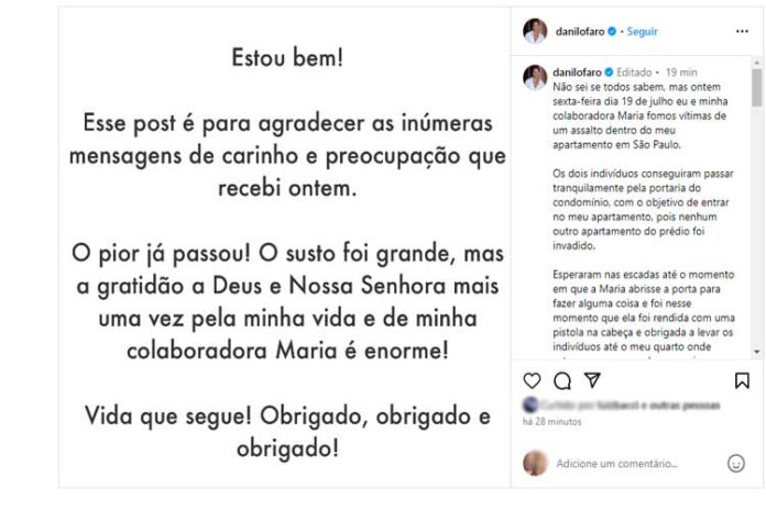 Neste sábado (20), o empresário fez um desabafo agradecendo a todos pela preocupação e dizendo que o pior já passou. Segundo Danilo, os indivíduos conseguiram entrar com tranquilidade pela portaria do condomínio onde mora.
