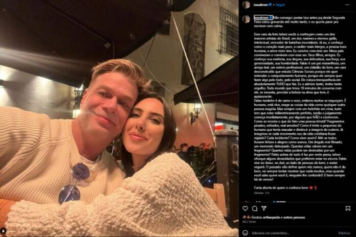 A atriz de Fuzuê continuou: “Quantas vidas cabem em um fragmento? Quantas vidas podem ser destruídas por um fragmento? Fabio acima de tudo é luz por onde passa, talvez ofusque alguns desavidados que preferem estar no escuro. Fabio vive no Amor, no Axé, ao lado de pessoas do bem, e assim seguirá. O passado não define quem nós somos, quem não é do bem, vai sempre tentar mostrar que nada mudou…mas quando você sabe quem você é, ninguém lhe confunde!! O bem sempre há de vencer!”, finalizou Isa, afirmando que era uma carta aberta de quem o conhece bem.