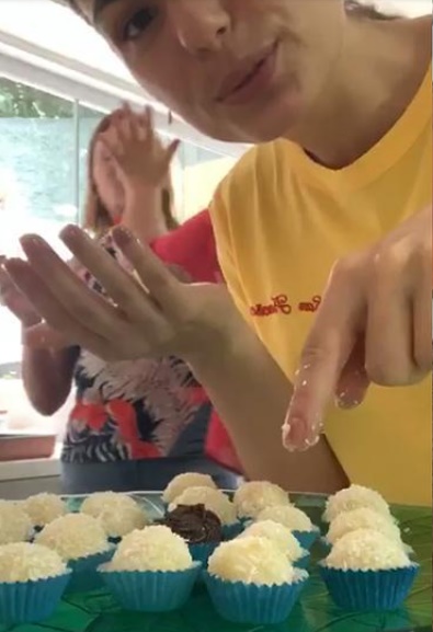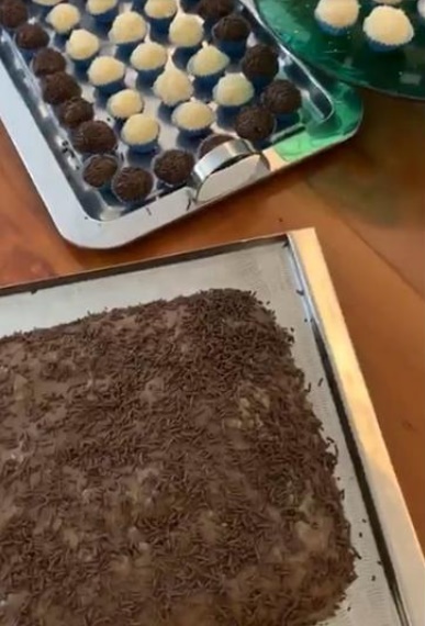 “É a primeira festa do meu filho. A gente fez questão de fazer tudo para ele. Estamos fazendo os docinhos do Rael. Olha que delícia, eu que fiz! Quando ele viu o bolo, ele pirou!”, contou ela, toda sorridente.