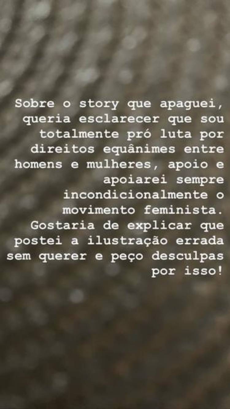 “Sobre o Story que apaguei, queria esclarecer que sou totalmente pró-luta por direitos equânimes entre homens e mulheres, apoio e sempre apoiarei incondicionalmente o movimento feminista. Gostaria de explicar que postei a ilustração errada sem querer e peço desculpas por isso!”, disse ela aos seguidores.