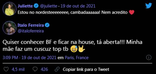 Não demorou muito e Ítalo respondeu: “Quiser conhecer BF [Baía Formosa, sua cidade natal, no Rio Grande do Norte] e ficar na house [casa], tá aberta!!! Minha mãe faz um cuscuz top também.”. Os fãs ficaram em alvoroço e muitos voltaram a shippar os dois. E você, torce pelo possível casal?