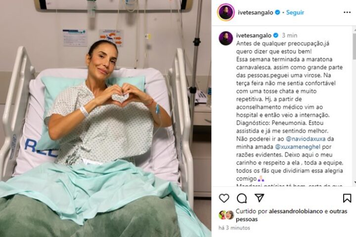 Por meio do feed no Instagram, Ivete Sangalo publicou uma foto em seu leito hospitalar e explicou na legenda que havia sido diagnosticada com pneumonia. “Antes de qualquer preocupação, já quero dizer que estou bem!“, iniciou a cantora.