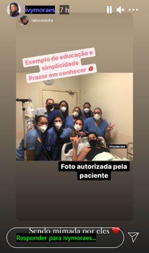 Nas redes sociais, a atriz mostrou que foi bem paparicada pela equipe do hospital, que fez questão de tirar um clique com a ex-BBB, que autorizou o compartilhamento da foto e depois publicou no stories do Instagram.