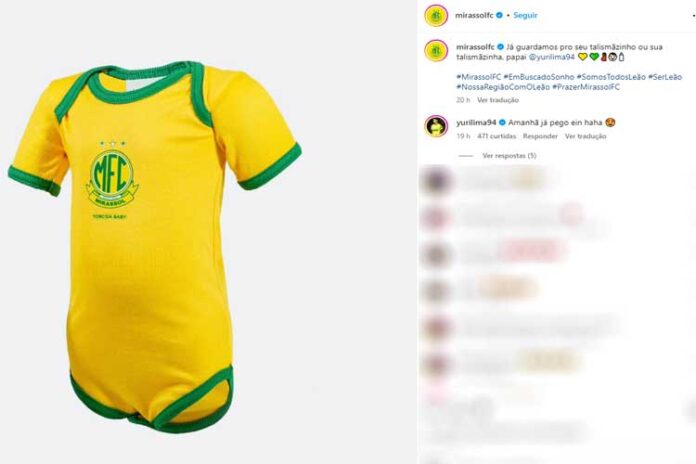 O jogador Yuri Lima compartilhou com seus seguidores nesta quinta-feira (11) um presente especial recebido de seu time, o Mirassol. Após Iza anunciar que está grávida do seu primeiro filho com o futebolista, ambos foram presenteados com um body com o brasão e as cores do time.