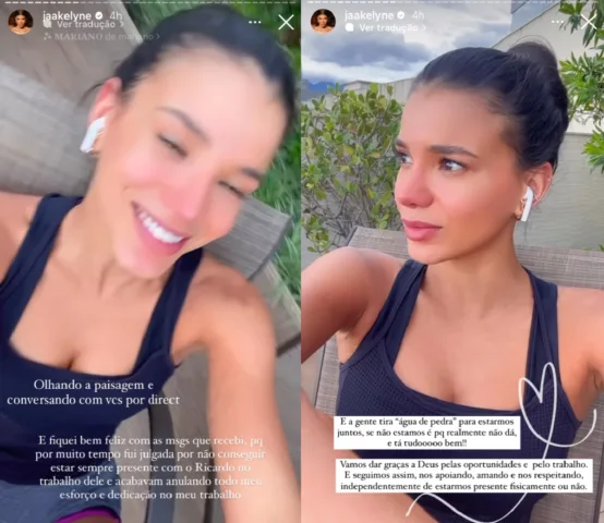 ”Olhando a paisagem e conversando com vocês por direct. E fiquei bem feliz com as mensagens que recebi porque por muito tempo fui julgada por não conseguir estar sempre presente com Ricardo no trabalho dele. E acabavam anulando todo meu esforço e dedicação no meu trabalho”, iniciou ela.