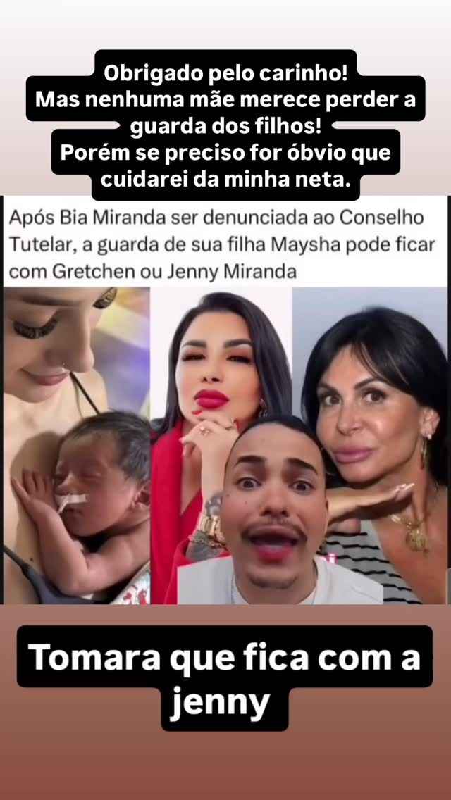 Entre os muitos rumores que surgiram com a repercussão do caso, um deles sugere que a guarda da pequena Maysha, filha de Bia Miranda, poderia ficar justamente com Jenny Miranda, avó da criança. A possibilidade tem dividido opiniões na internet.