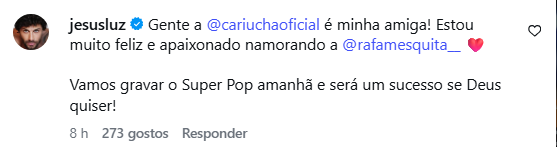 Na postagem, Cariúcha também havia se pronunciado e revelou que Jesus Luz é apenas seu amigo: “Não, ele é meu amigo e está aqui desde domingo. Estou com ele, fazendo companhia e mostrando São Paulo para ele, entendeu? Chamei ele para fazer o programa comigo amanhã; vai para o ‘SuperPop’ gravar uns negocinhos”, contou ela.