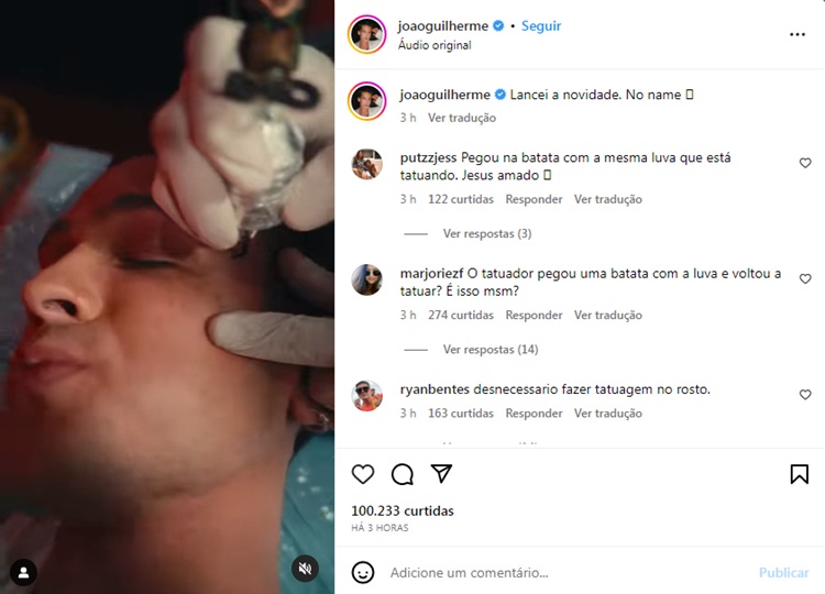 Em seu perfil oficial no Instagram, João Guilherme postou um vídeo fazendo uma nova tatuagem. Desta vez, o artista fez um desenho no rosto. Ele não mostrou a finalização do trabalho, mas não agradou os fãs. “Lancei a novidade. No name”, escreveu ele na legenda do post.
