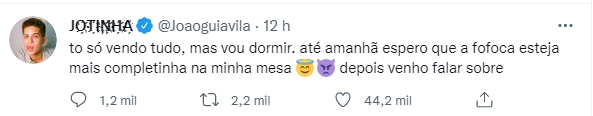 Com a repercussão da historia, João Guilherme foi até o twitter e se pronunciou sobre o assunto : “Estou só vendo tudo, mas vou dormir. Até amanhã espero que a fofoca esteja mais completinha na minha mesa. Depois venho falar sobre”